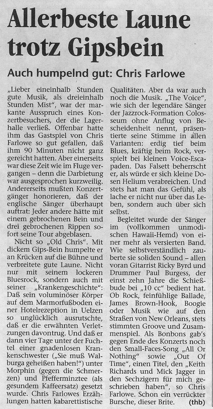 Am 05.12.1998 gab Chris Farlowe ein bemerkenswertes Konzert in der Osnabrücker Lagerhalle. Mit Gipsbein und sehr guter Band. Dem Kommentar von Tom Bullmann, aus der Neuen Osnabrücker Zeitung vom 08.12.1998, ist nichts hinzuzufügen. Chris Farlowes Version des Small Faces Klassikers „All Or Nothing“ fanden meine Frau und Sängerin Doro so gut, dass wir den Song auch mit unserer damaligen Nachspielband „Noisy Neighbours“ gecovert haben. Wir spielten zu der Zeit mit der eben genannten Coverband einige Male in einer der zahlreichen britischen Kasernen in Osnabrück: Bei „All Or Nothing“ war die Tanzfläche sofort voll.